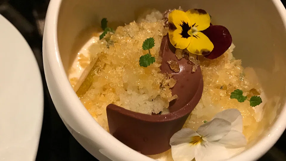 A playful mish-mash of shaved pear ice, sabayon, pistachio sponge and stretchy chocolate "leather" (S$18) is a circus in the mouth, with added fireworks from pop rocks. It's more fun than stylish and the chocolate too leathery but we're more than happy to lap up spoonfuls of fun.