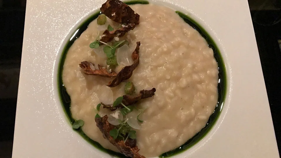 A risotto of "winter grains" and Jerusalem artichokes (S$24) is satisfying for a vegetarian option - creamy, al dente rice infused with artichoke flavour, adorned with crunchy artichoke chips.