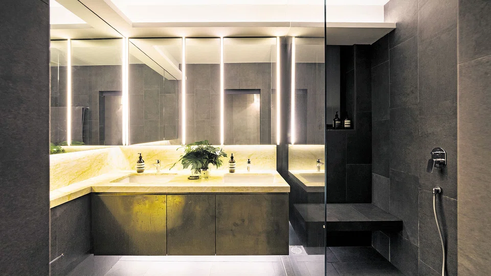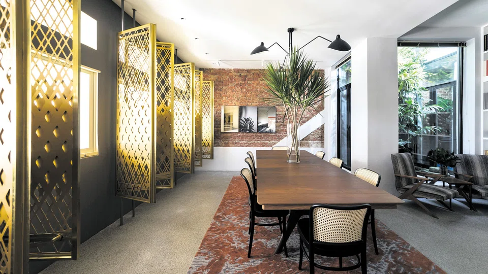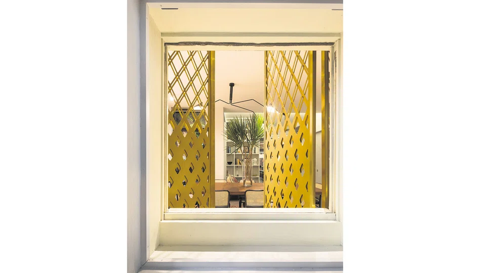 In an area where most of the SIT flats have more conventional window grilles, this apartment has grilles with a golden patina. The brass screens, placed behind four large windows, and mounted on aluminum and steel frames, form a diamond pattern. On some days, those who walk by just see these screens, and if they are lucky, the screens are opened and they get a sneak peek into the apartment. "It is quite amusing sometimes to watch people casually walk past, then retract their steps and look into the apartment," says the owner, who works in branding and advertising. "I don't really mind it."