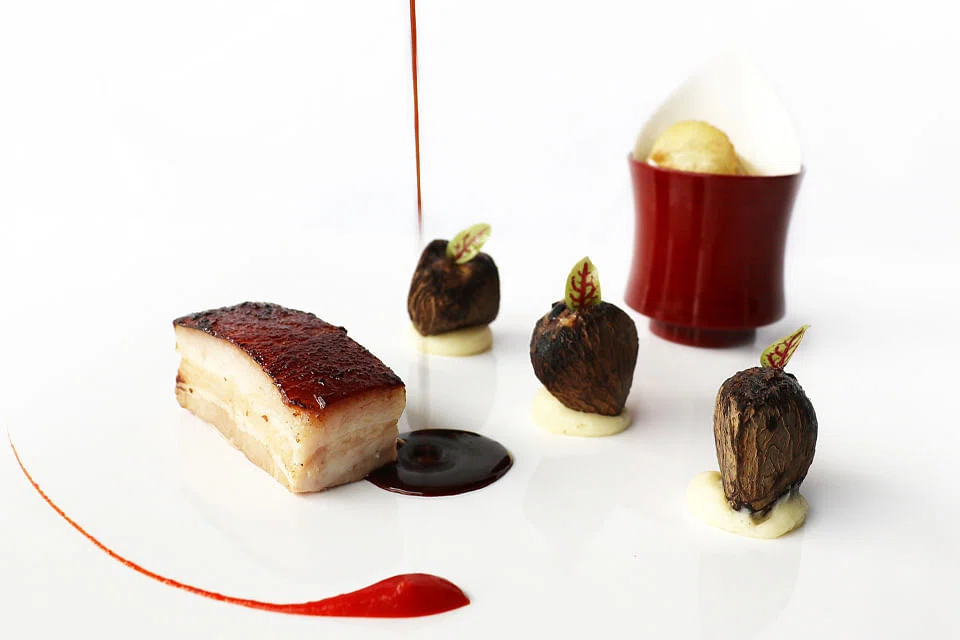 For some reason, buah keluak and foie gras work together like magic - sauteed with minced pork and stuffed back into the black nutshell, it really goes well with the fatty pork slices dressed with a smear of buah keluak sauce and perky dots of piquillo pepper cream.