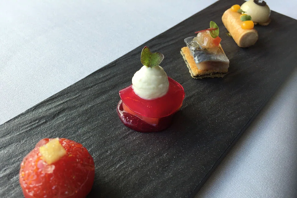 You definitely want to have the amuse bouche - a beautiful line-up of little bites that include a cherry tomato with a crackling sugar crust and filled with espuma; bouncy little square of silky gravlax on sweet beetroot and a pat of wasabi; sardine on crunchy olive toast; and whipped foie gras piped into a crispy filo roll.