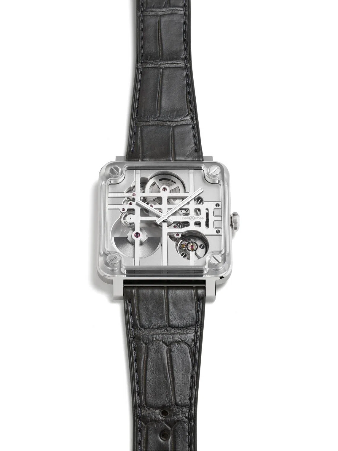 “We wanted to preserve the unique construction of the movement with its horizontal and vertical lines,” says de Nonancourt of the linear, grid-like architecture that is central to the watch’s visual appeal. Not only does the 40-mm BR-03 case house the movement, it also forms part of its structure, with the square case middle directly supporting the bridges, so that case and calibre become a single entity. This radical assembly relies on just three elements: a central steel plate forming the case-movement block, and an upper and lower sapphire crystal.