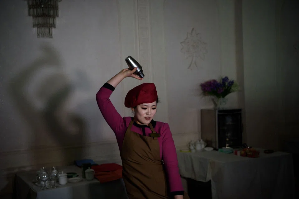 Video provided to Reuters by North Korea's official news agency KCNA, which Reuters cannot independently verify, showed North Korean cooks preparing and presenting various traditional Korean dishes at the Pyongyang Noodle House, the venue for the competition. "The pheasant meat is good for people's health and the meat itself has a sweet taste, so there's no need to add many seasonings", said Pak Hye Ok, chef of the Bongnam Noodle House, who presented the pheasant meatball broth. "Nothing can defeat a fresh pheasant meat if it is well seasoned with salt." In a crowded hall where the entries were displayed and judged, people snapped pictures and took video on their mobile phones as female bartenders threw shakers in the air as they made blue drinks decorated with cherries, pineapple slices and cocktail umbrellas.