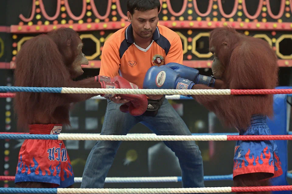 BOXING gloves raised, two orang- utans enter a ring in a Thai zoo - a spectacle that fascinates locals and foreigners alike but sits increasingly at odds in a nation slowly embracing animal welfare.