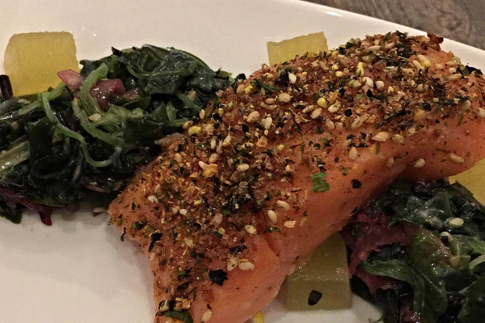 Slow-cooked 42 degree salmon (S$15) is no match for Tetsuya Wakuda's salmon confit, with a too-soft texture that barely flakes, sitting on a bed of seaweed salad in a sesame dressing and a welcome contrast of compressed apple cubes.