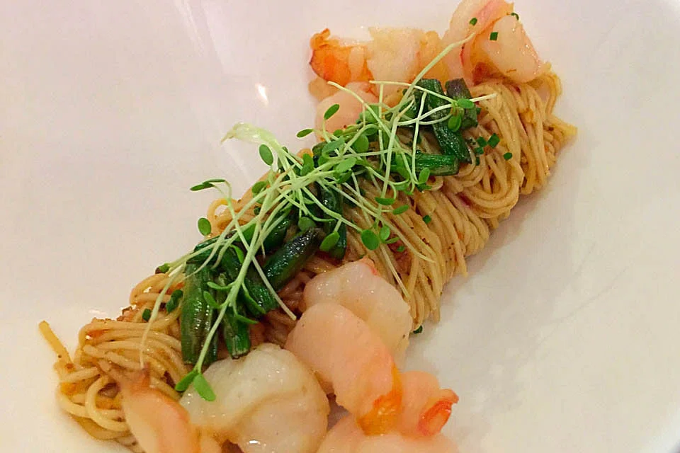 At Kite, the chef - who used to work at Bacchanalia - has a lot of cooking ideas. He has so many that the only way to eat them all is in very small portions (hence the small plates concept) while sitting in very uncomfortable kopitiam chairs. It is his idea, for one, to slowly render the oil out of Chinese sausages to create a flavourful dressing with garlic bits that is tossed with cold somen and topped with warm, bouncy shrimp (S$12). It's an interesting adaptation of the now-familiar angel hair pasta with sakura ebi, except that the floury texture of the noodles and the skinny beans get in the way of our enjoyment.