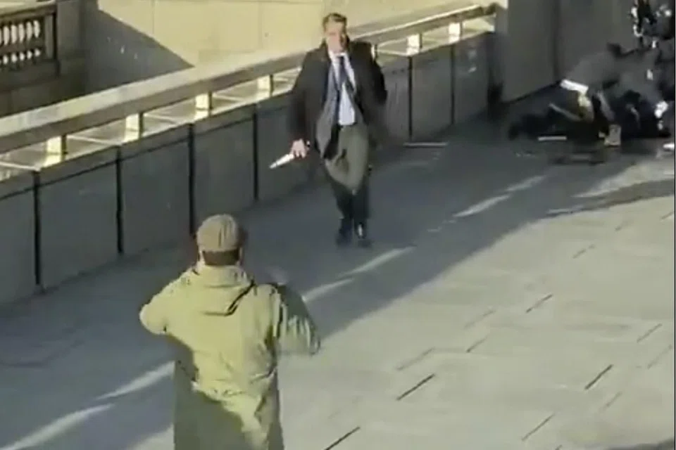 A video posted on Twitter showed a group of about half a dozen men wrestling with someone on the ground on the sidewalk of the bridge. One of them backs away from the scene carrying a knife.