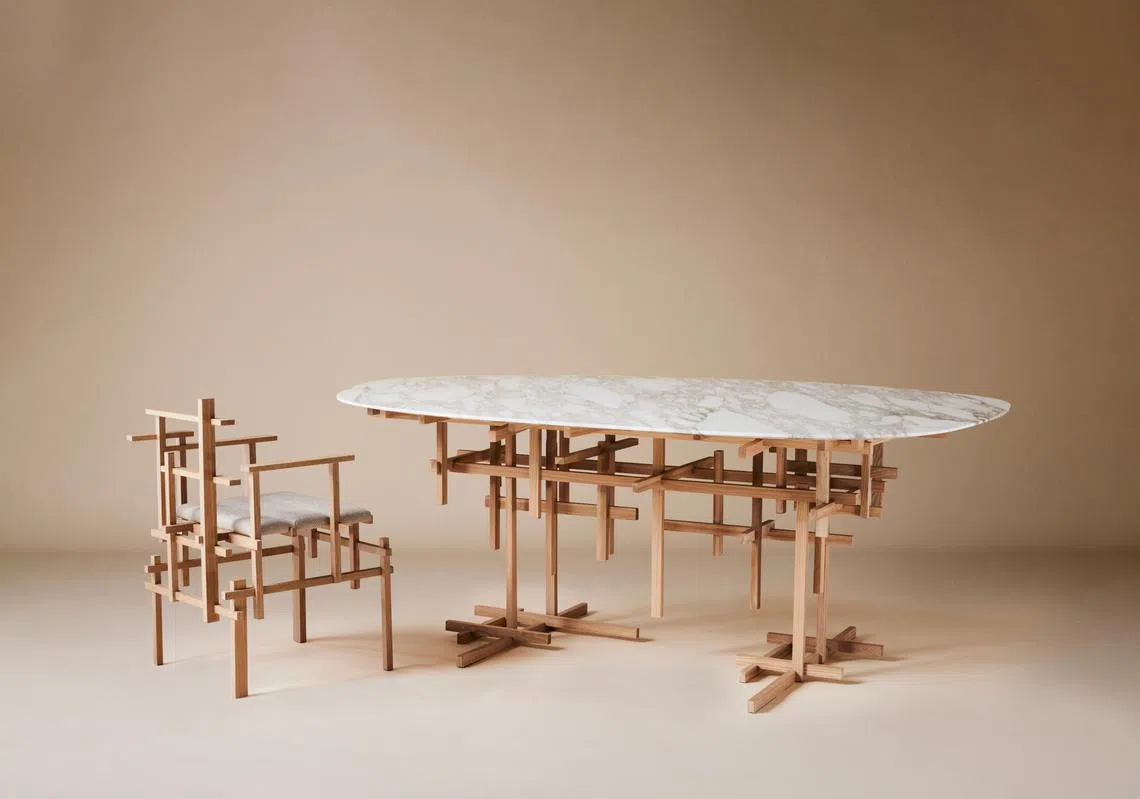 The Migumi collection features a dining table and chair. Calacatta marble is layered upon an intricate frame of white oak, designed to create dynamic shadows according to shifting sunlight. Kuma was inspired by the sunlight he encountered while designing the Aman Miami Beach Residences (targeted for completion in 2026).