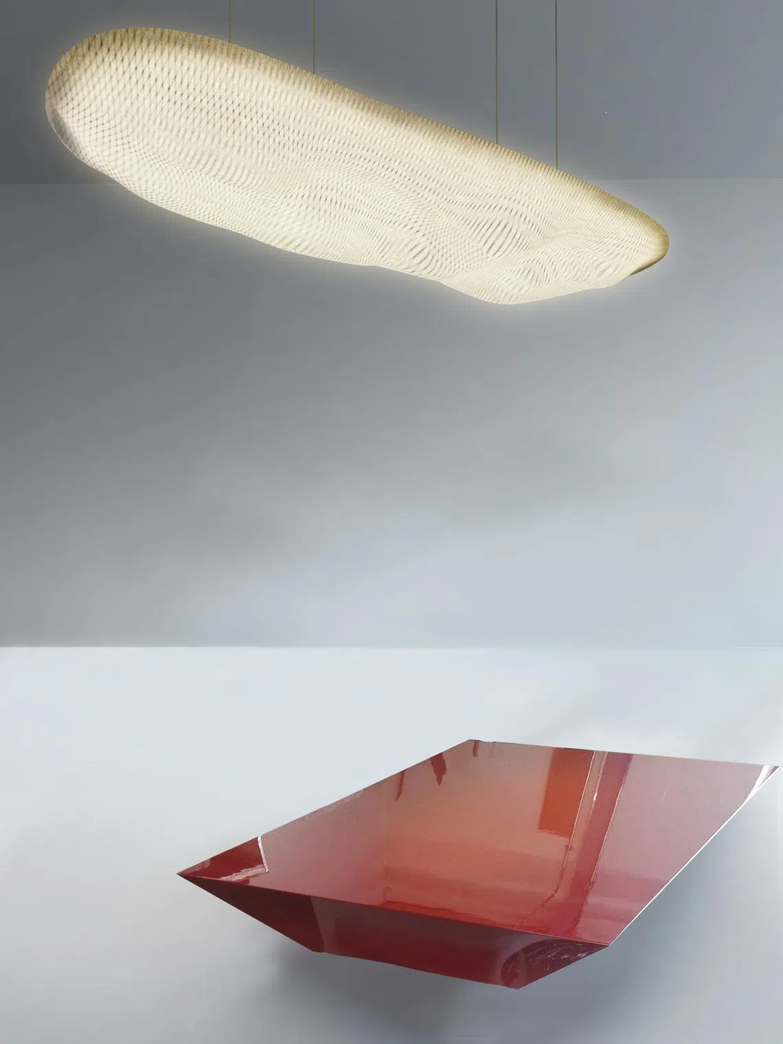 Kuma’s Urushi collection, comprising a console, coffee table, chandelier, dining table and screen, showcases the traditional Japanese technique of urushi. The gloss and fiery red colour of the lacquering craft dating back 9,000 years emphasises the pieces’ sleek, modern forms.