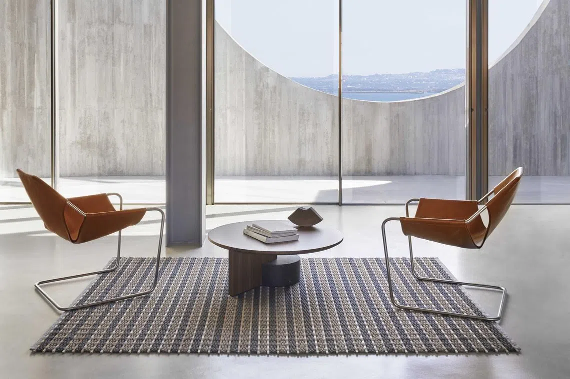 Kuma’s dexterity with materials is seen in the Goz collection for Gan – the rug-making arm of Spanish furniture company Gandia Blasco. Each rug features teak wood rods – a material rarely used in rug-making – woven into a framework of virgin wool using a manual loom. The result contrasts the softness, density and warmth of wool with the consistency of wood.
