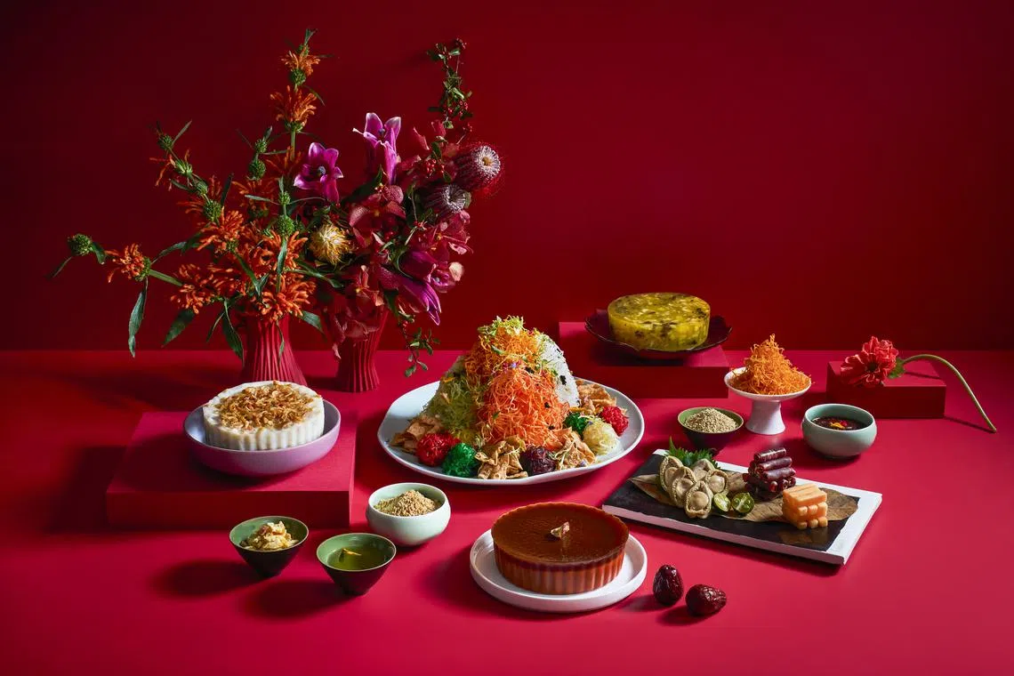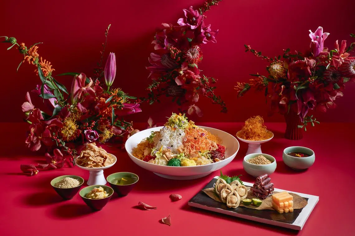 Pick from a trio of platters comprising: Fortune Yusheng with salmon sashimi and sakura shrimp (from S$108 net); Longevity Yusheng with octopus and sea whelk (from S$152 net); and Prosperity Yusheng, an indulgent mix of abalone, Spanish Iberico ham, and honey melon (from S$172 net).