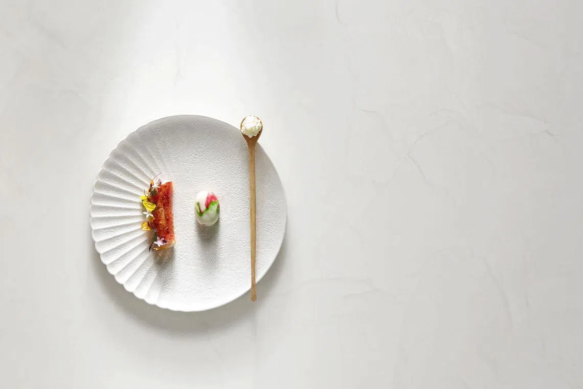 Among the starters is a tomato capsule, ''a ball that bursts in your mouth and is inspired by my Dad who used to pickle everything in sour plum with a bit of chili''. Abalone with burnt chilli pesto is based on his memory of eating cockles in Perak (where his family is originally from). His enterprising mother would shell the cockles and sell them to suppliers for income, and his use of abalone signifies ''how life is getting better for my family, and how we've come from being poor to enjoying a decent standard of living''. Even an Alaskan crab dumpling has its roots in his childhood, with the glutinous rice ball reminding him of tang yuan and family reunions.