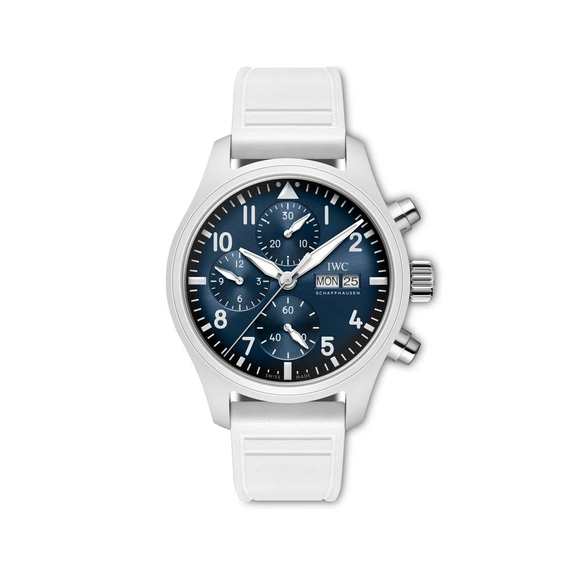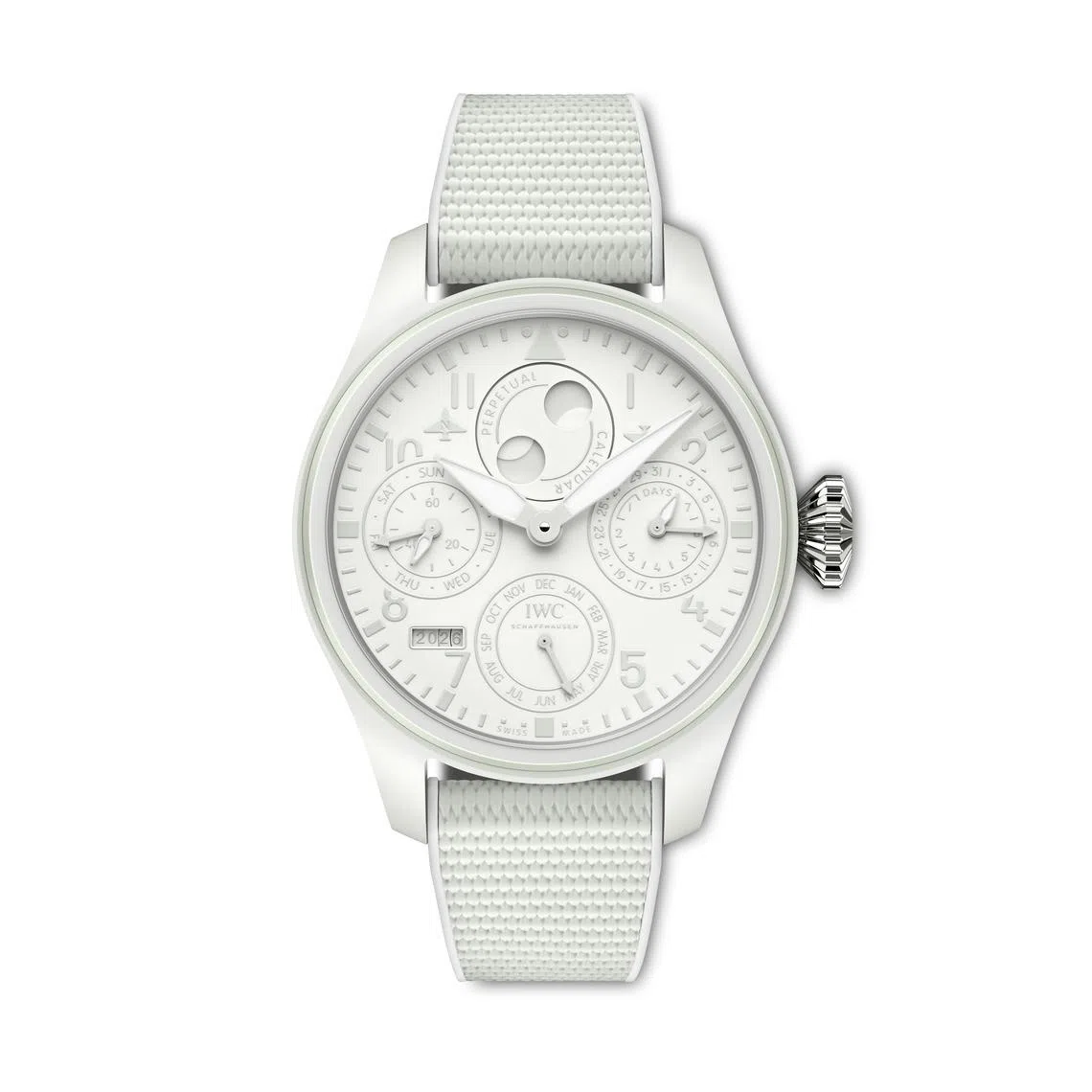 Thanks to the ceramic compound’s enrichment, the entire Big Pilot’s Watch Perpetual Calendar Ceralume – including the 46.5 mm luminous white case, the white dial and white rubber – can glow in the dark in a vivid blue hue for more than 24 hours.