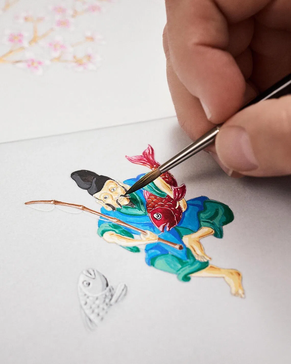 Framing the scene are sakura cherry blossom appliques in yellow gold, enamelled in gradations of pink and red, also gently animated.