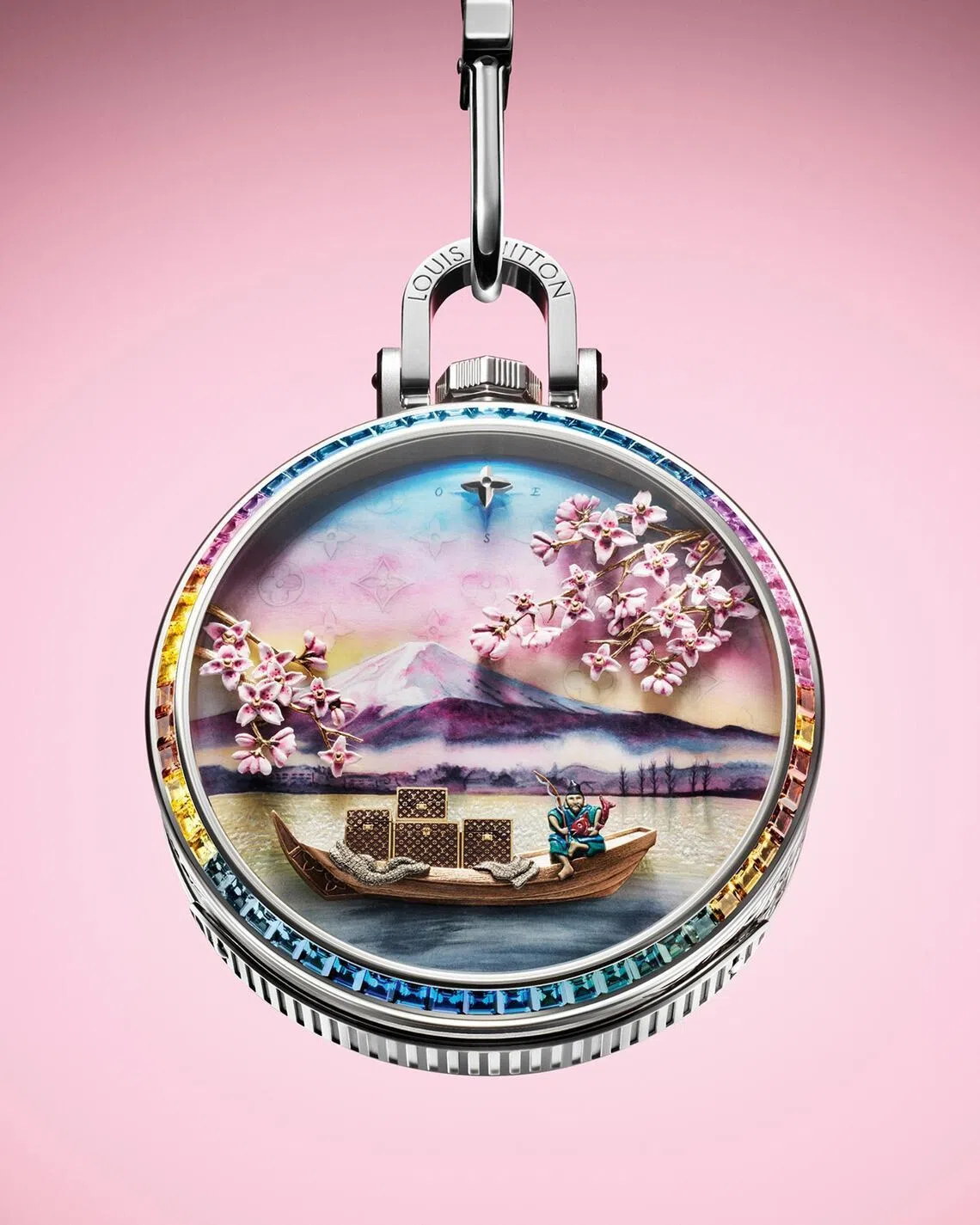 The dial is stunning: an ode to Japan in spring, with the sun rising behind Mount Fuji beneath a sky washed in pink, blue and yellow. In the foreground, a wooden fishing boat crosses the shimmering river, carrying Louis Vuitton trunks in gold.