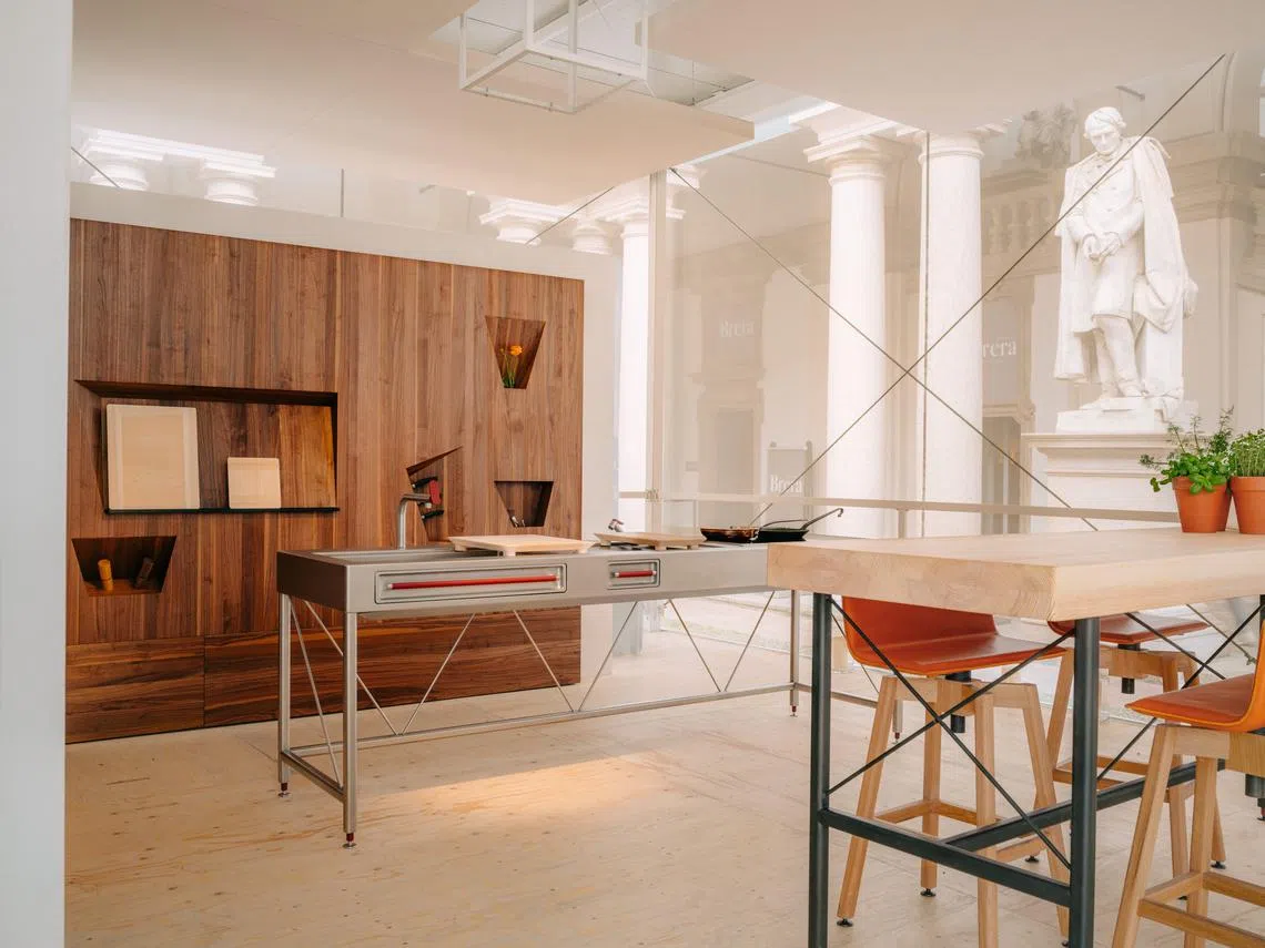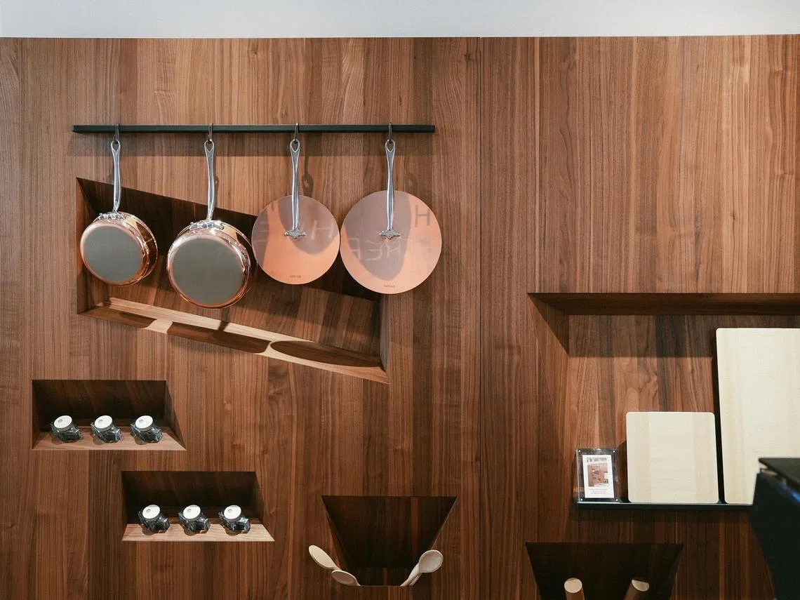 Complementing the workbench is the new bulthaup wall system, made of rich walnut wood panels strengthened with inner layers of metal. It’s infinitely customisable with polygonal recesses that fit everything from utensils to cookware and household gadgets.