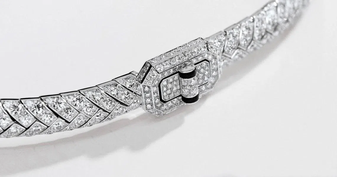 This strong, statement piece holds a surprise at the back – a diamond-paved swivel clasp that mimics that of Chanel’s iconic 2.55 handbag.