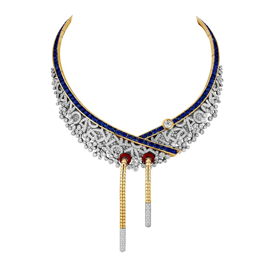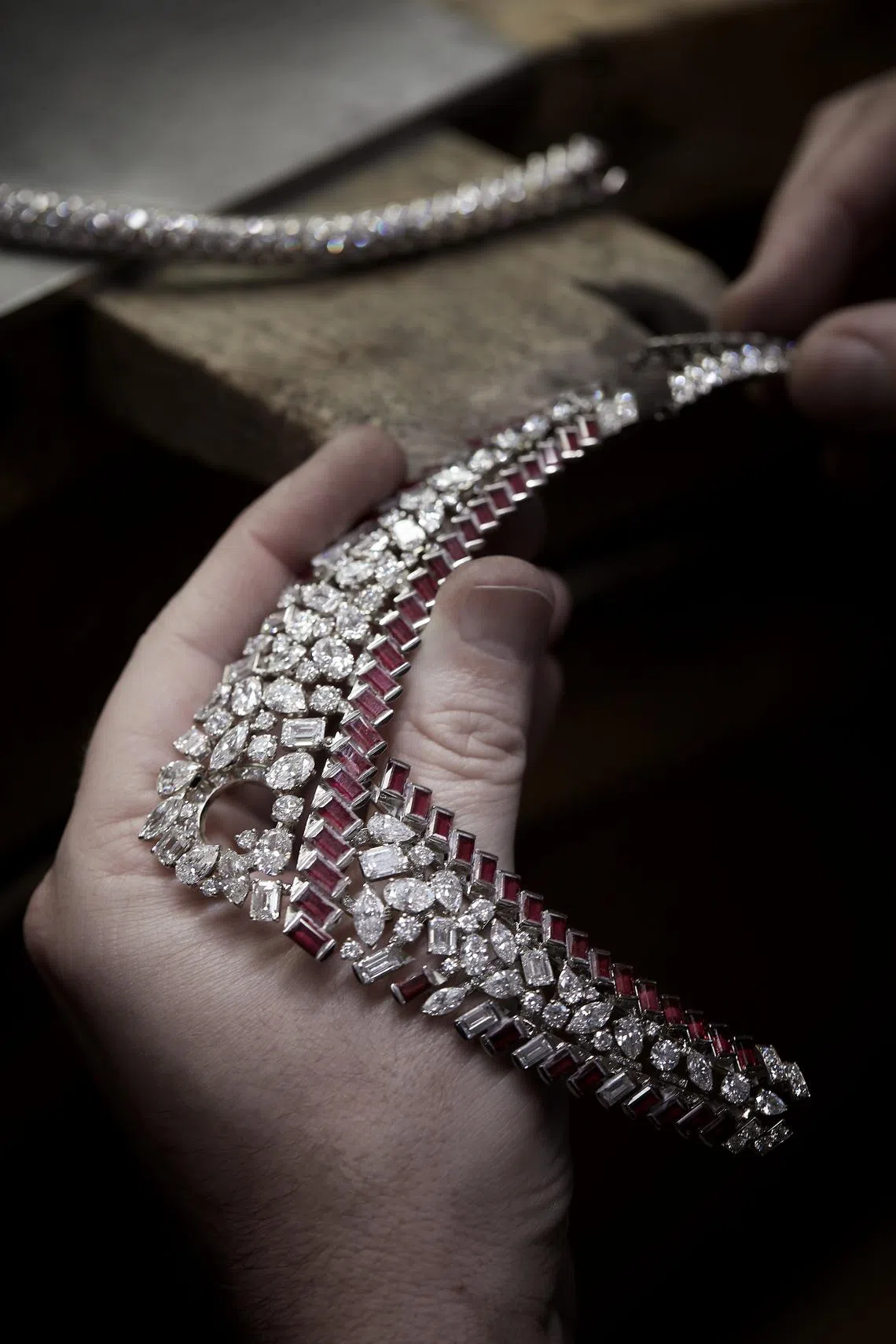 One of these is a centrestone in the necklace, whose chevron motif enlarges towards the front, filling out with no less than a luscious stream of fancy-cut diamonds, and bordered on one side by a graduated line of diagonally-set baguette rubies.