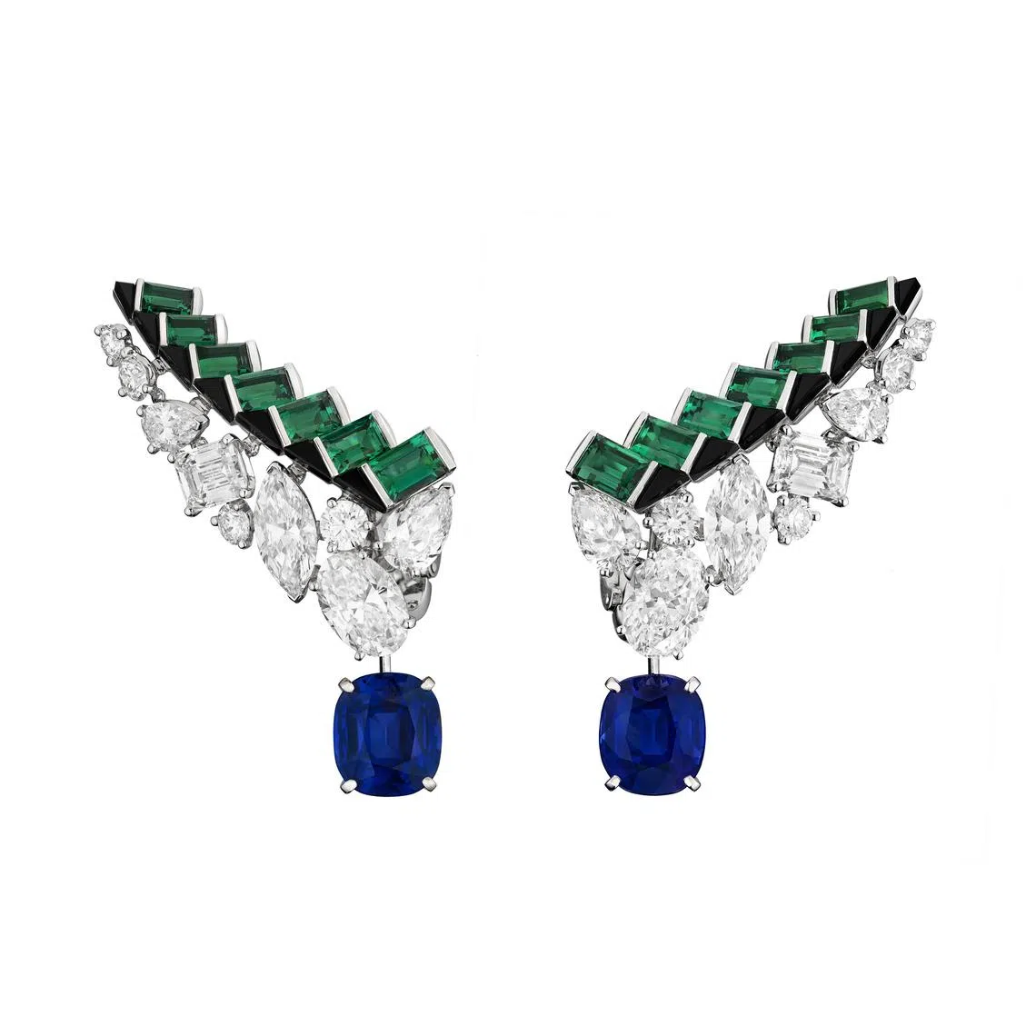 Finally, a pair of earrings in white gold and platinum, with diamonds, emeralds, onyx and a dangling Kashmir sapphire on each side, complete the prized set.