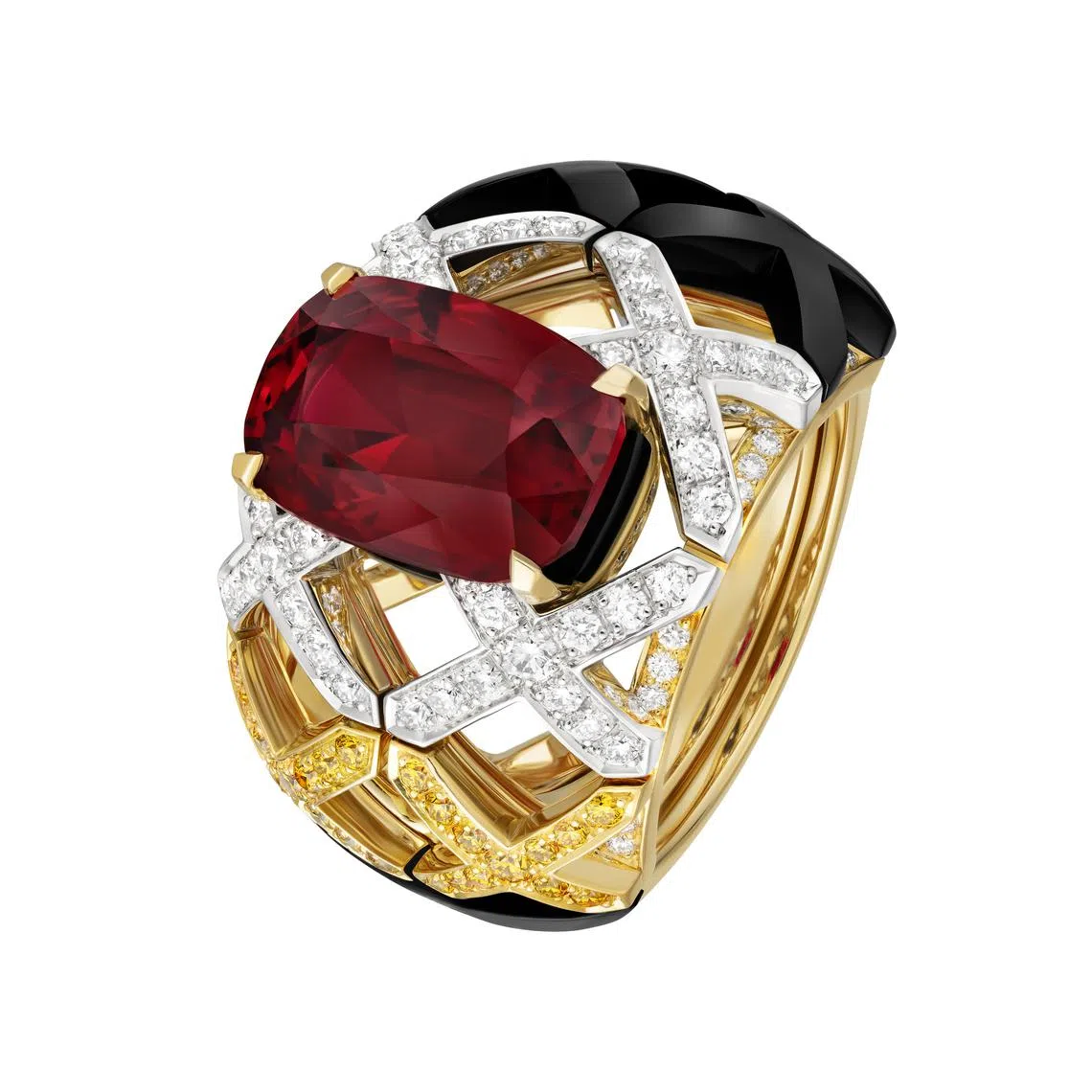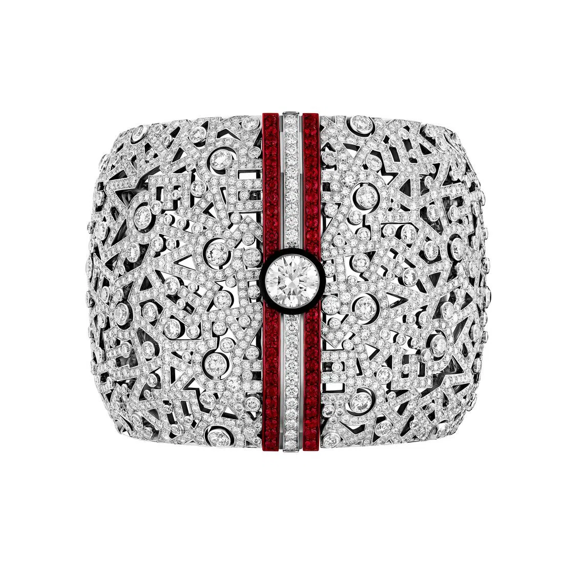 This particular chapter takes the Chanel logo and merrily deconstructs it, so the letters of the maison’s name scatter in the form of a lacework. A signature creation in this chapter is a one-off pair of cuffs developed in the spirit of sporting equipment. With it, two new materials were introduced for the first time into the maison’s high jewellery world – carbon and anodised aluminium.