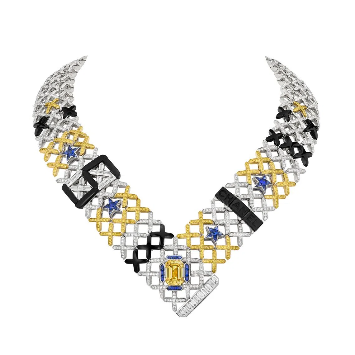 These are joined by Chanel’s iconic number 5, the “CHANEL” inscription and stars – symbols of victory. In particular, the one-off Quilted Stars necklace opens at the front when its centre yellow diamond is pivoted to release a safety clasp. This technical feat delivers a revolutionary approach to high jewellery that is both surprising and oh, so clever.