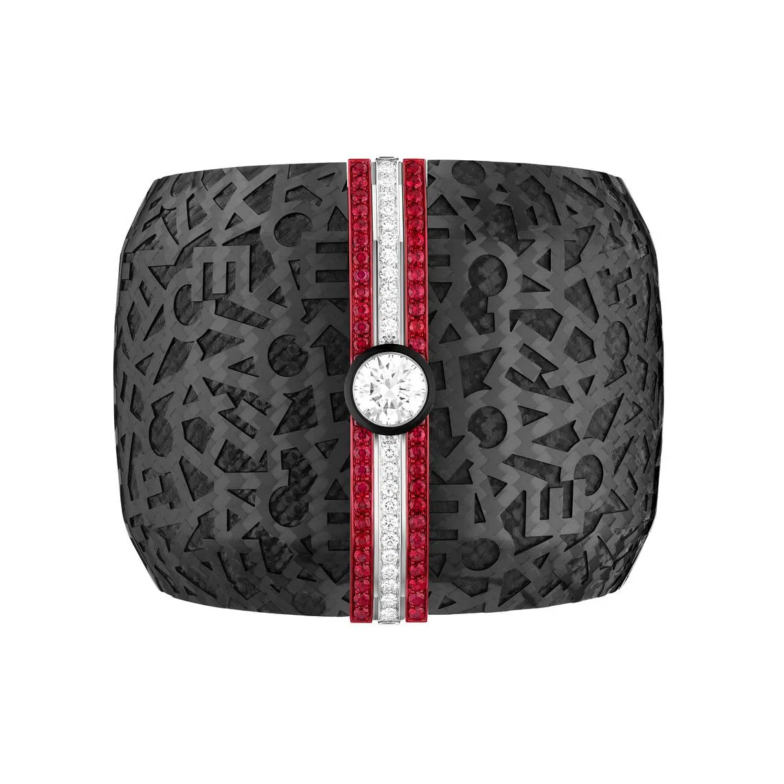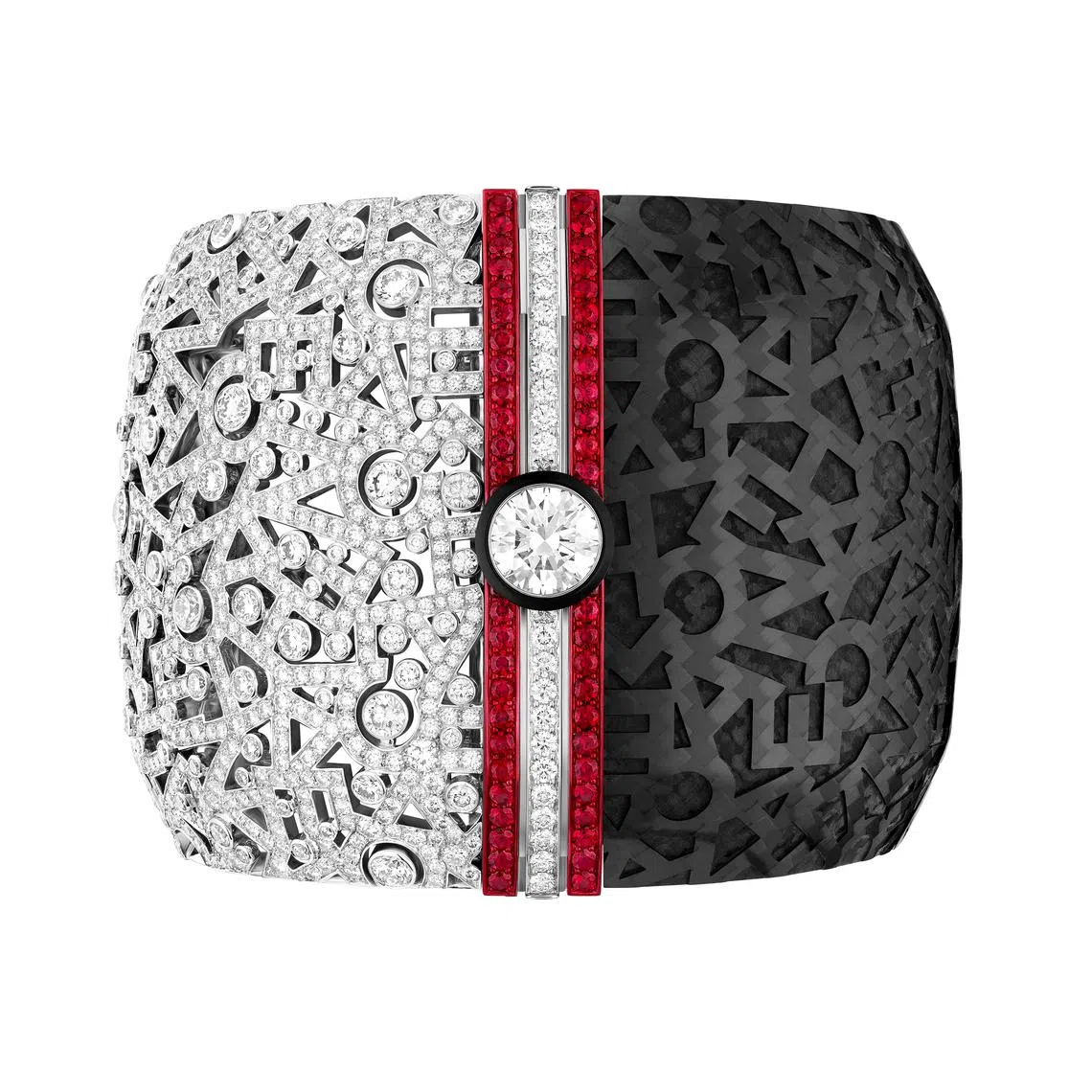 These materials were chosen for their light weight and ability to allow for surface treatment respectively, and make up two halves of a set of cuff “shells”. The other cuff is made of white gold and diamonds. The two sets of “shells” can be attached to a central line dressed in diamonds and rubies, and voila – you have a transformable cuff that can be worn in three different ways.