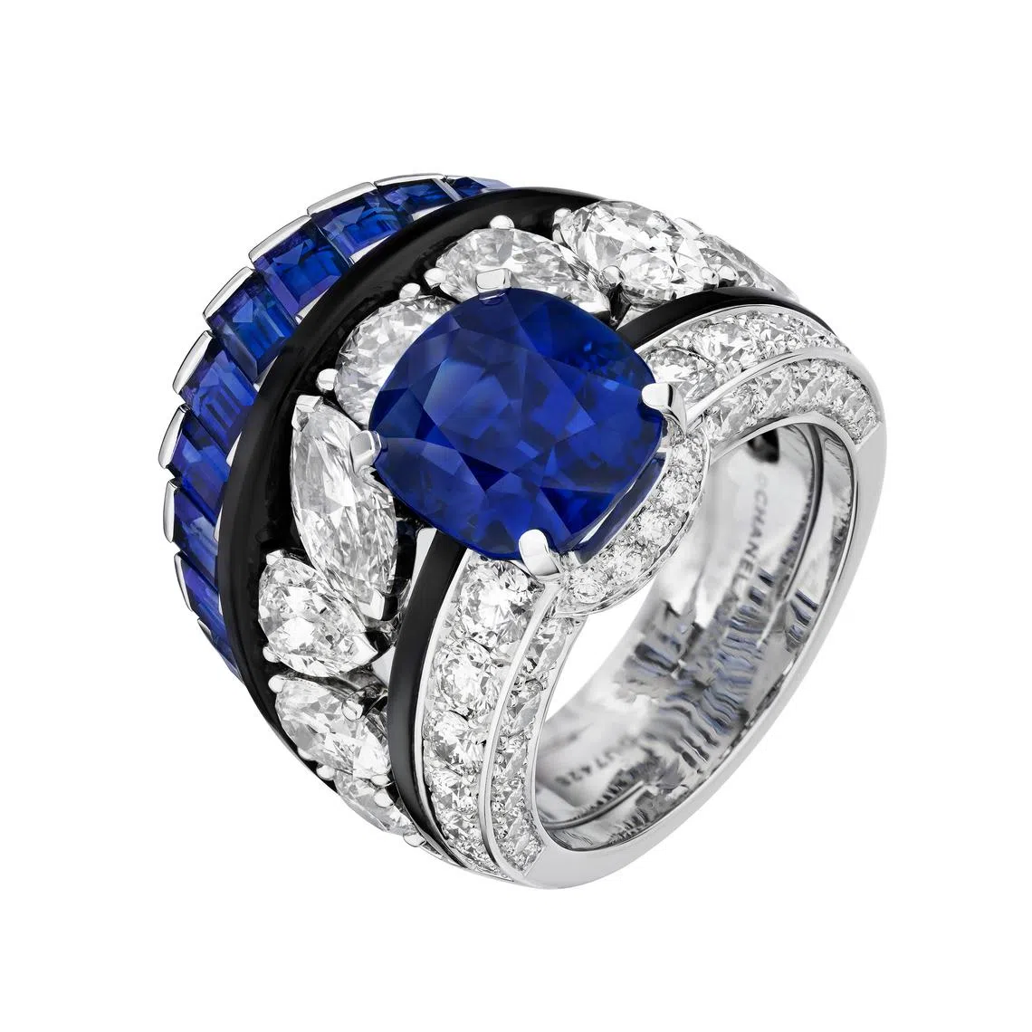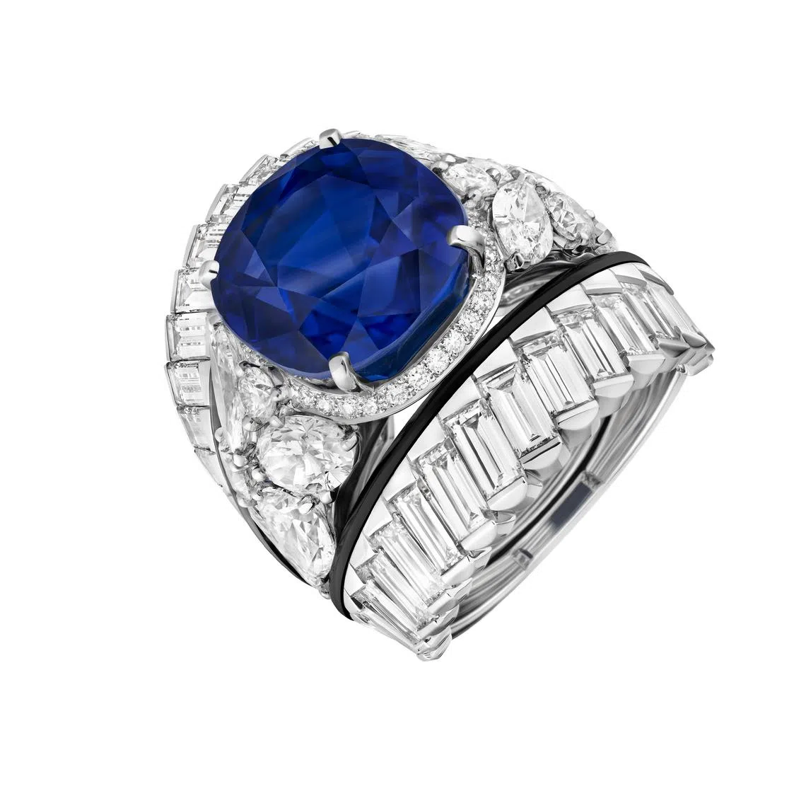 Of the five precious Kashmir sapphires, the largest – at 17.18 cts – graces one of the two diamond and onyx cocktail rings in this set. This ring in white gold and platinum can be worn in three different ways, as its ring jacket can be detached from the central ring.