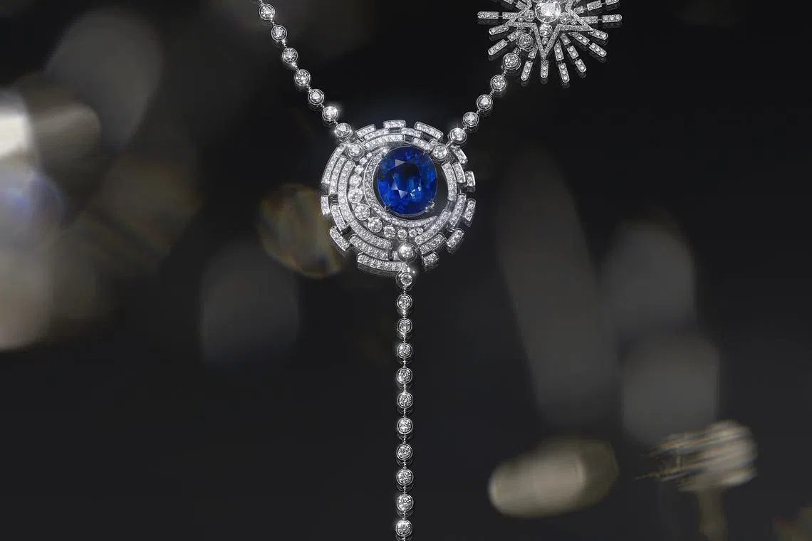Each motif is a star in its own right - a 55.55-carat (5 being Coco Chanel’s favourite number) intense blue oval sapphire nestling in a crescent moon; a sun with an 8.05-carat pear-cut diamond at its heart emanating light through lines of diamonds; and a comet sparkling brilliantly from one side of the necklace.
