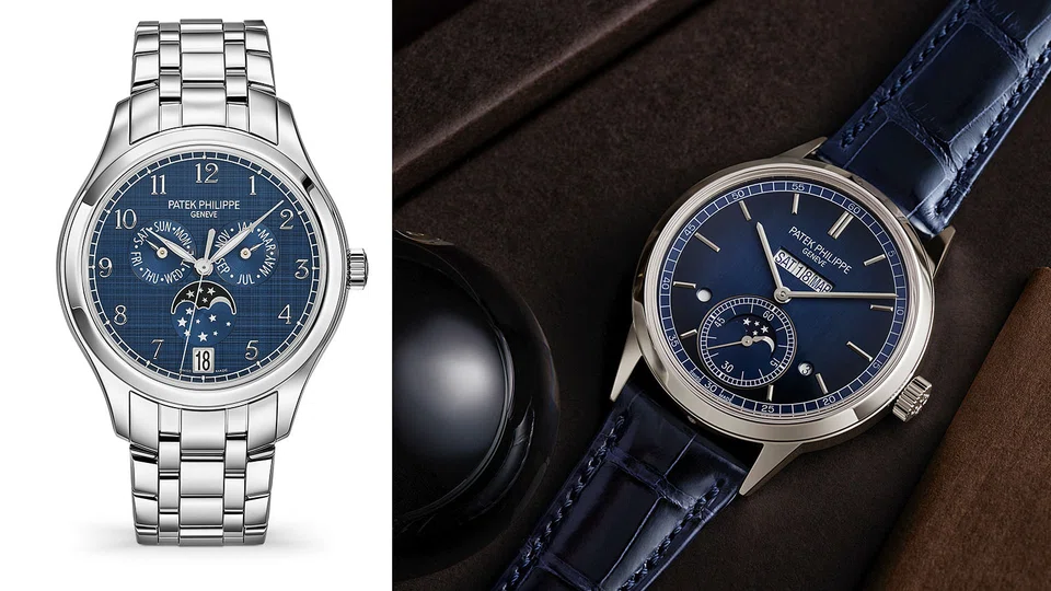 The star of the latest collection displays the day, date and month across in a straight line at 12 o'clock, which is a first for the brand. The linear layout on a vertical satin-finish blue dial offers a more intuitive view and natural reading of the calendar indication than the classic arrangement of three sub-dials -and it makes for a very clean and uncluttered dial as well. These are made possible by a new automatic movement which has three patent applications filed. While the new calibre requires more parts and is more complex, Patek Philippe contains the mechanism in a sleek platinum case that's just 41.3 mm wide and 11.07 mm high.