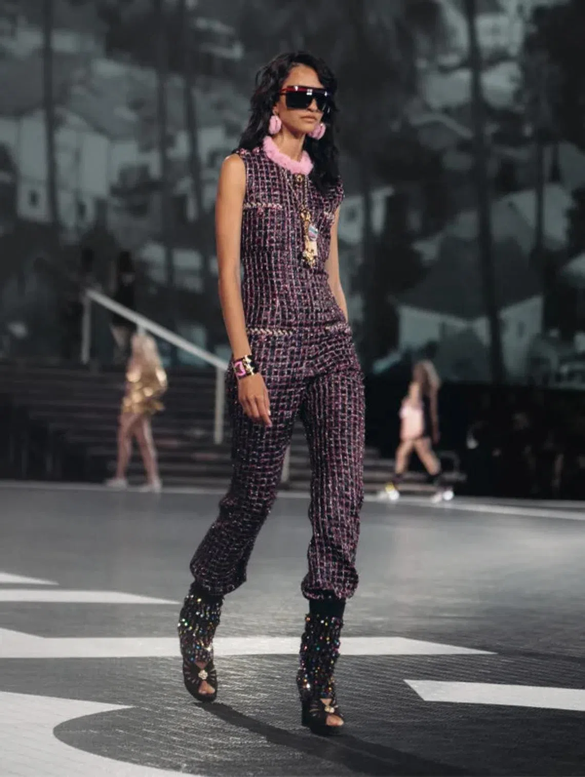 Take this printed silk muslin look from Chanel’s Cruise 2024 collection. Together, the blouse (S$4,630) and trousers (S$4,480) give off a columnar look and prim vibe, setting off the playful print. Sneakers and gold jewellery add to its cool street appeal while retaining an indubitable glam.