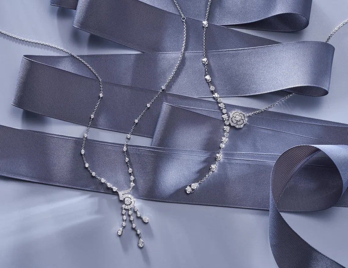 Similarly, Chanel’s selection of fine jewellery recalls Mademoiselle Chanel’s favourite motifs in glittering glory. Her cherished flower, the camellia, is the focus of diamond necklaces, earrings, brooches, pendants and rings, instantly recognisable with its perfectly symmetrical form and pleasing roundness.