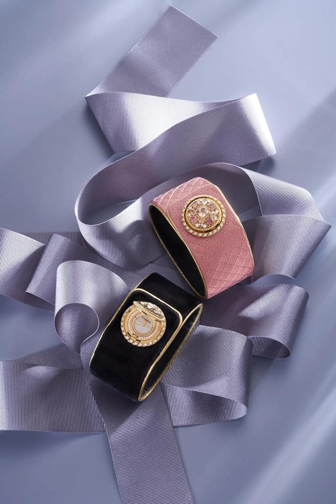 Inspired by the sleeves of the iconic tweed jacket and its buttons, each delightful “button” – featuring Chanel icons such as the pearl, camellia and knot – opens to reveal a sparkly diamond-studded dial. The watches’ cuffs, too, come in classic Chanel textures such as quilted leather and tweed.