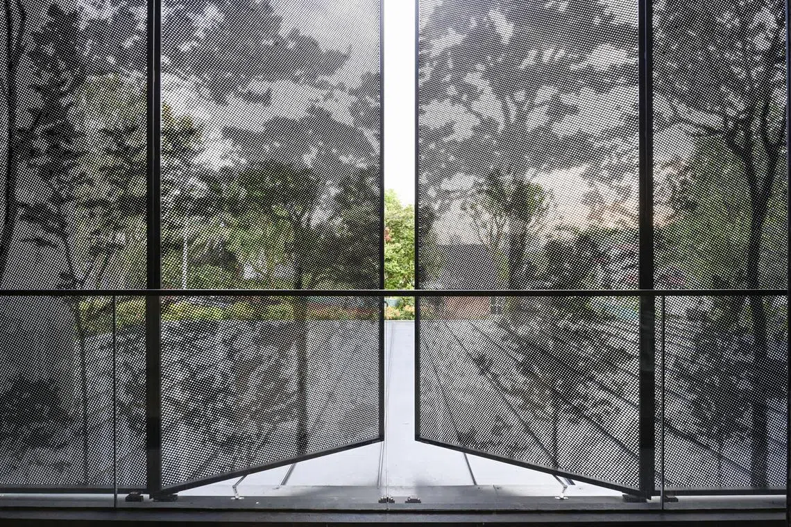 Tree patterns are even introduced on the specially commissioned metal screens on the second floor, where the guest bedroom faces the street. From inside, you see what looks like the pleasing silhouette of a forest, and from outside, the shapes of the foliage pop when the lights come on at night.
