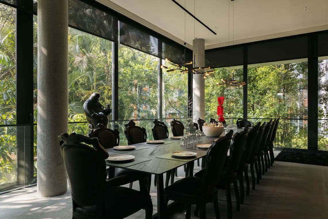 As you proceed deeper into the home, dubbed The Green Sanctuary, you are struck by its porosity – full-height windows that dramatically frame the view of lush greenery on the side and back of the building.