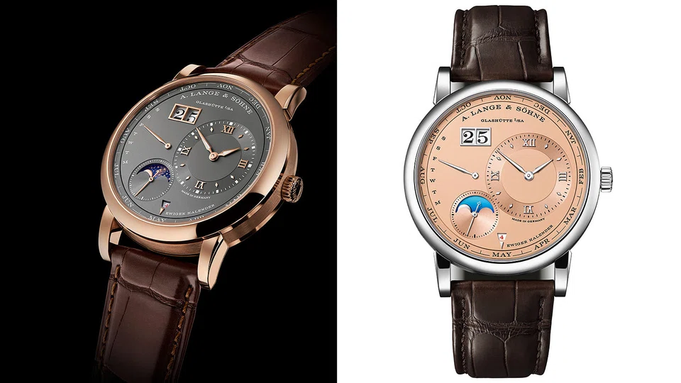 The Lange 1 Perpetual Calendar comes in a pink gold case with grey dial and in white gold case and a pink-gold dial; the latter is limited to 150 pieces. Prices: 98,000 euro (pink gold); 109,000 euro (white gold).