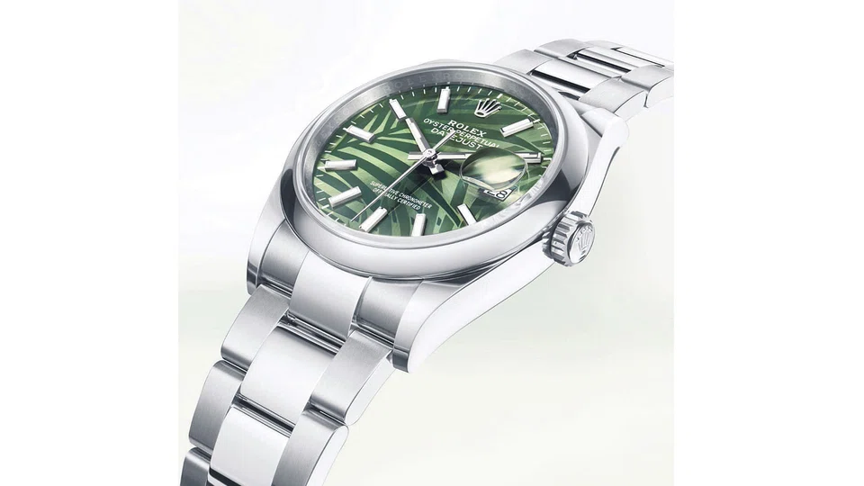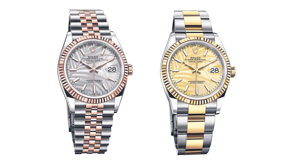 An olive green branch of palm leaves on a matching colour background marks out the first of the watches, an all-stainless steel - Rolex calls it ''Oystersteel'' - Datejust 36 , including the ''Oyster'' bracelet. The same design in gold decorates the yellow gold face of the second Oystersteel and 18 ct yellow gold - yellow ''Rolesor'' - Datejust 36, fitted with a matching colour Oyster bracelet.