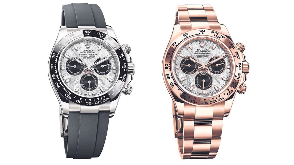 There are three versions of the new Cosmograph Daytona, and they all sport a metallic meteorite - a rare natural material from outer space - dial with black chronograph counters at 3, 6 and 9 o'clock. A black Cerachrom (ceramic) bezel displaying a tachymetric scale rims the face of the 18 ct white gold chronograph watch, held by an Oysterflex bracelet. The tachymetric scale is moulded into the Cerachrom bezel.