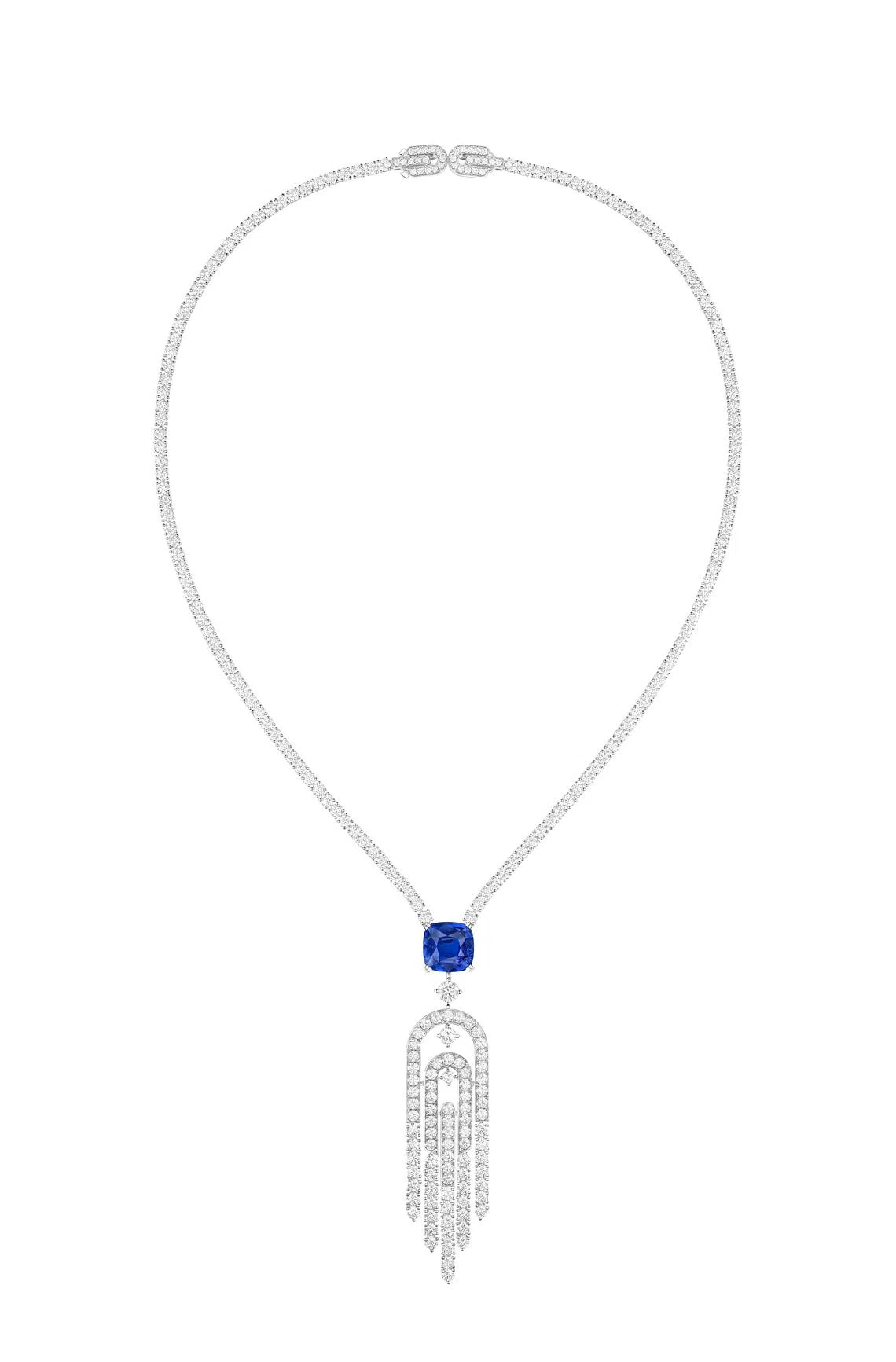 In the second set of jewels, the star is a 7.13-carat, cushion-cut royal blue Sri Lankan sapphire, which sits over a vault-like waterfall of diamonds in a graceful, fluid necklace.