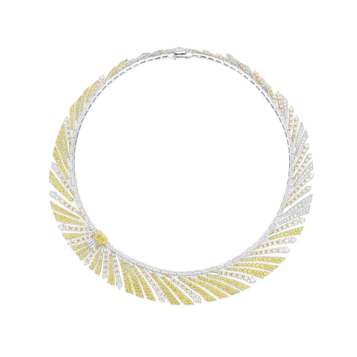 The strands of a bib necklace set with white and yellow diamonds sit delicately on the decolletage, at the heart of which rests a 2-carat, fancy intense yellow diamond. This gorgeous piece is joined by another necklace where the sun is shown to be at its strongest. Both are accompanied by transformable rings, earrings and a matching brooch, thus completing the illumination that so bewitched the maison’s founder.