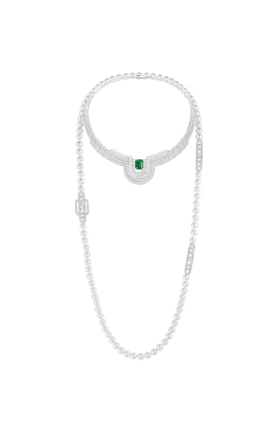 Take, for instance, a remarkable Colombian emerald now handsomely set in the hollow of a majestic, upturned arch of a necklace. Around this exceptional stone of over 4 carats are baguette- and brilliant-cut diamonds, finished with a string of pearls interrupted only by the fire of more diamonds set in a variety of arches.