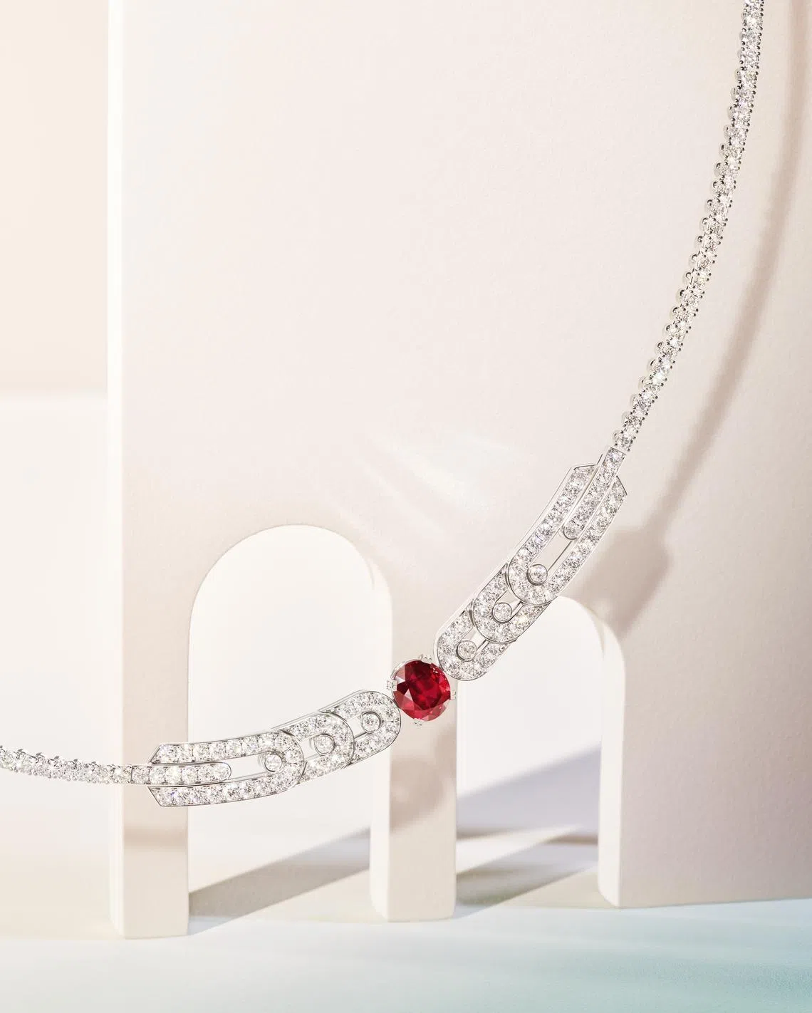 Then there is the blazing pigeon-blood red of the Mozambique ruby that’s the centrepiece of the third set of jewellery. Here, the 3-carat, oval-cut stone takes pride of place in the middle of a supple choker – highlighting the curve of cascading arches filled with diamonds.