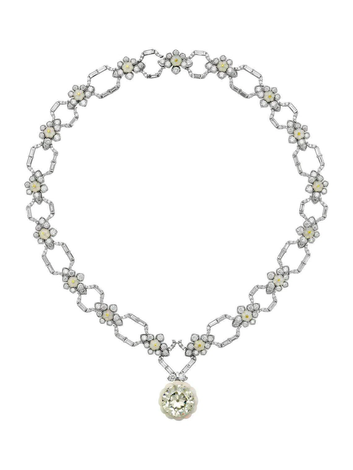 Gucci embraces both the crystalline characteristics of ice, as well as the joy of year-end celebrations with an enamel and diamond necklace, whose centrepiece is a milky, iridescent 92-carat opal. Channelling the season’s festivity and joy are diamonds – including one-of-a-kind European-cut antique diamonds.
