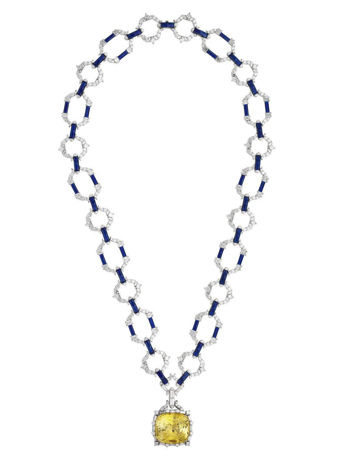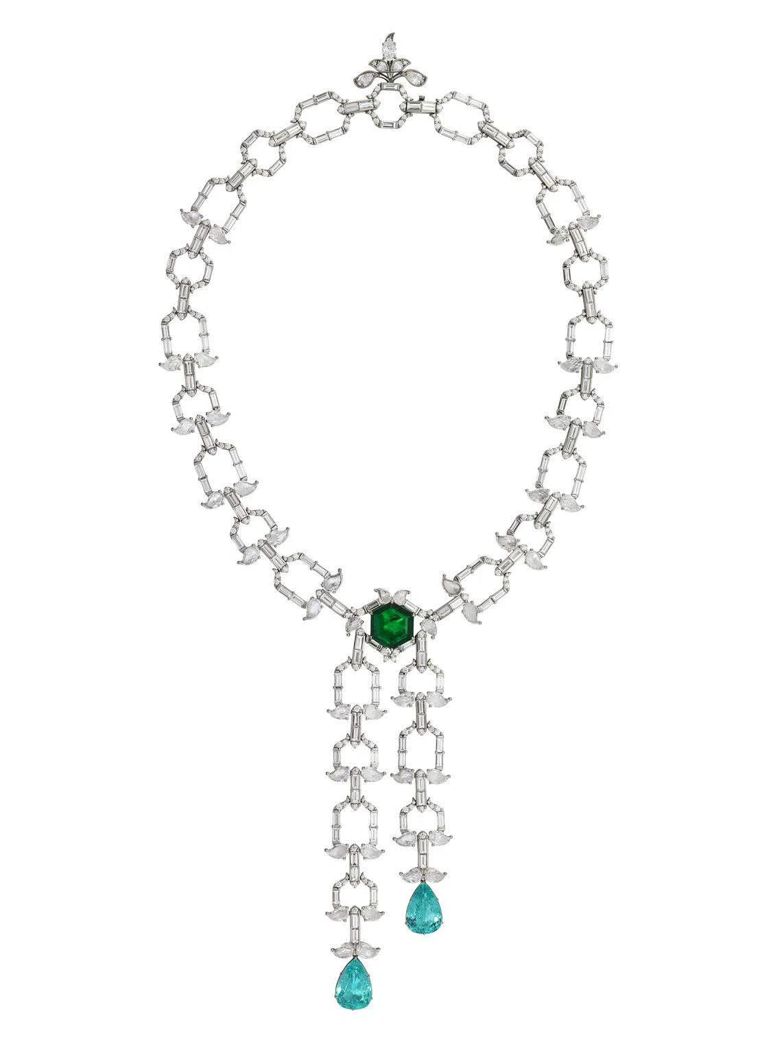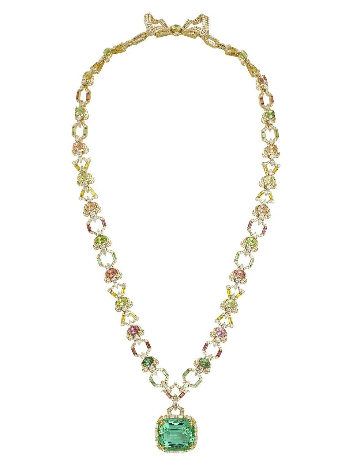 If pink is more your thing, there is a necklace bearing a 161-carat cushion-cut pink tourmaline that is encircled by multiple levels of diamonds and coloured enamel. This is then set on a chain generously adorned with 72 fancy tourmalines that together, create a spectacular chromatic degradé. Pure delight.