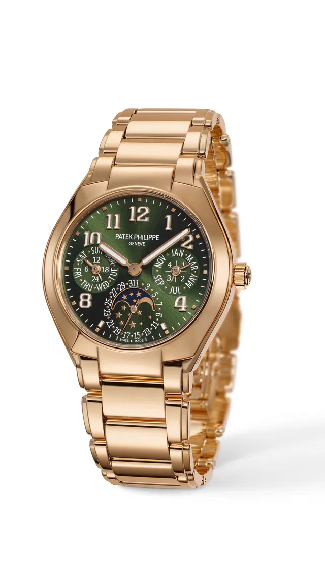 Yet, the complication watch is attractively slim at 9.95 mm, and comes dressed entirely in rose gold, including the bracelet. Its fully polished 36-mm rose-gold case frames a sunburst dial in a Christmassy olive green.