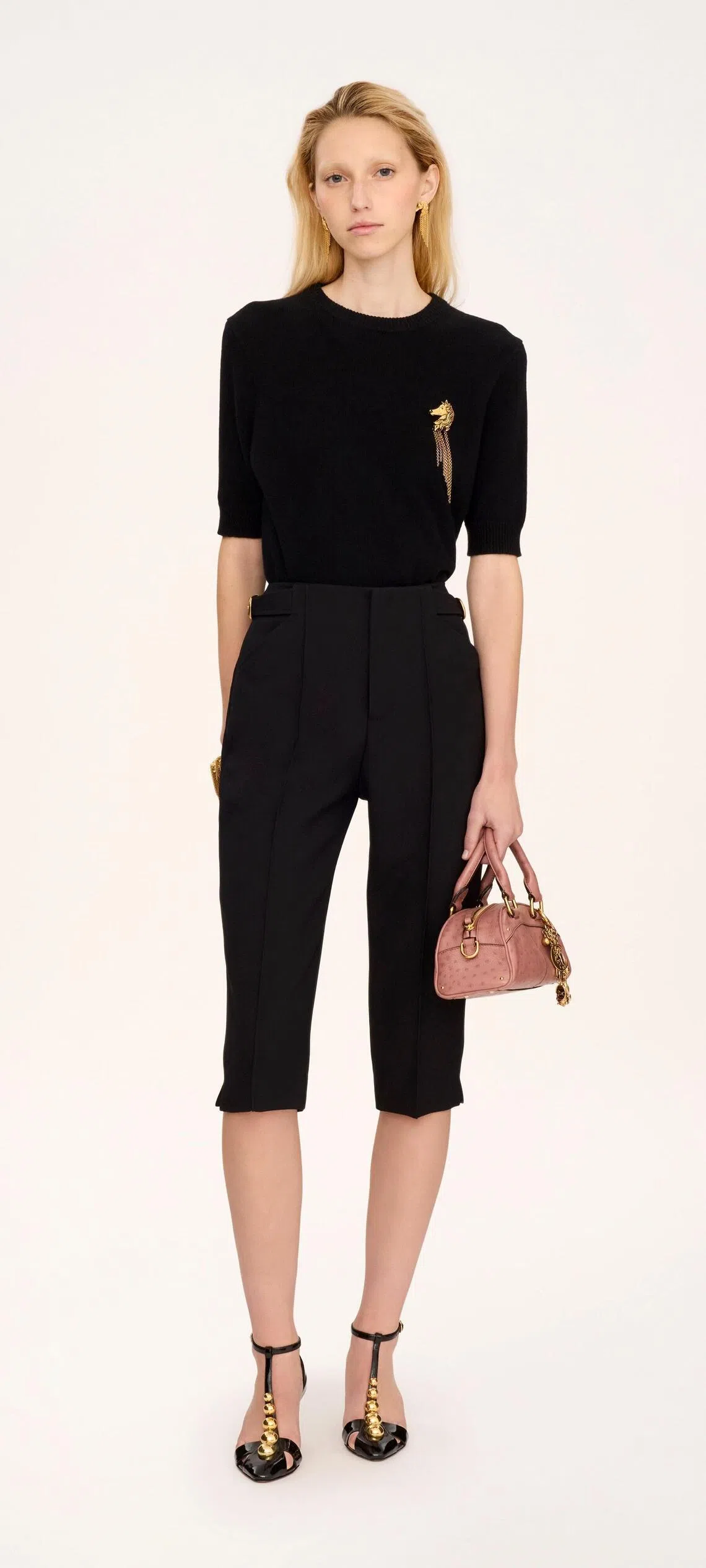 Chloe places the horse front and centre in a short-sleeved jumper (S$1,540). The contrast between the merino-cashmere knit’s deep black and the detachable gold-toned horse head draws the eye directly to the latter. Dangling tonally matched chains also imbue movement into the piece – more on that later on.