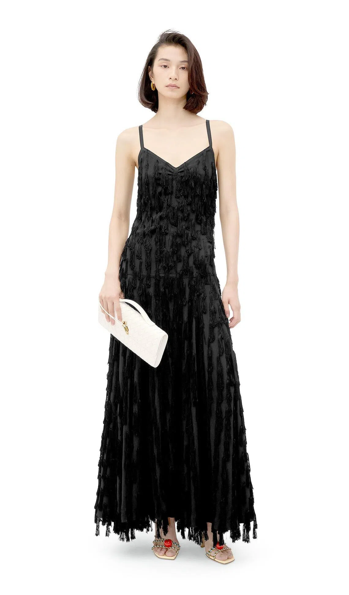 A dress covered entirely in fringe might sound like a recipe for something that’s reminiscent of Cousin Itt, but Bottega Veneta’s interpretation (S$9,690), rendered in a crepe fabric, keeps things on the buoyant side. The festive tassels add a touch of playfulness and joy to the otherwise minimal and sleek silhouette.
