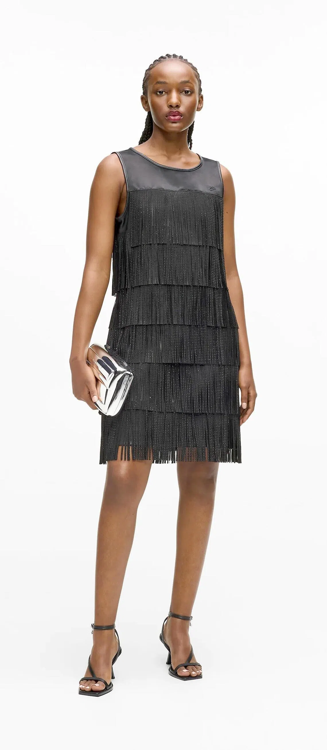 From Karl Lagerfeld, a fringed faux-leather dress (S$675) is given an extra pop with satin panels and glimmering embellishments, making for a great transition piece that goes easily from day to evening; nights out after visiting are sure to be a breeze with this.