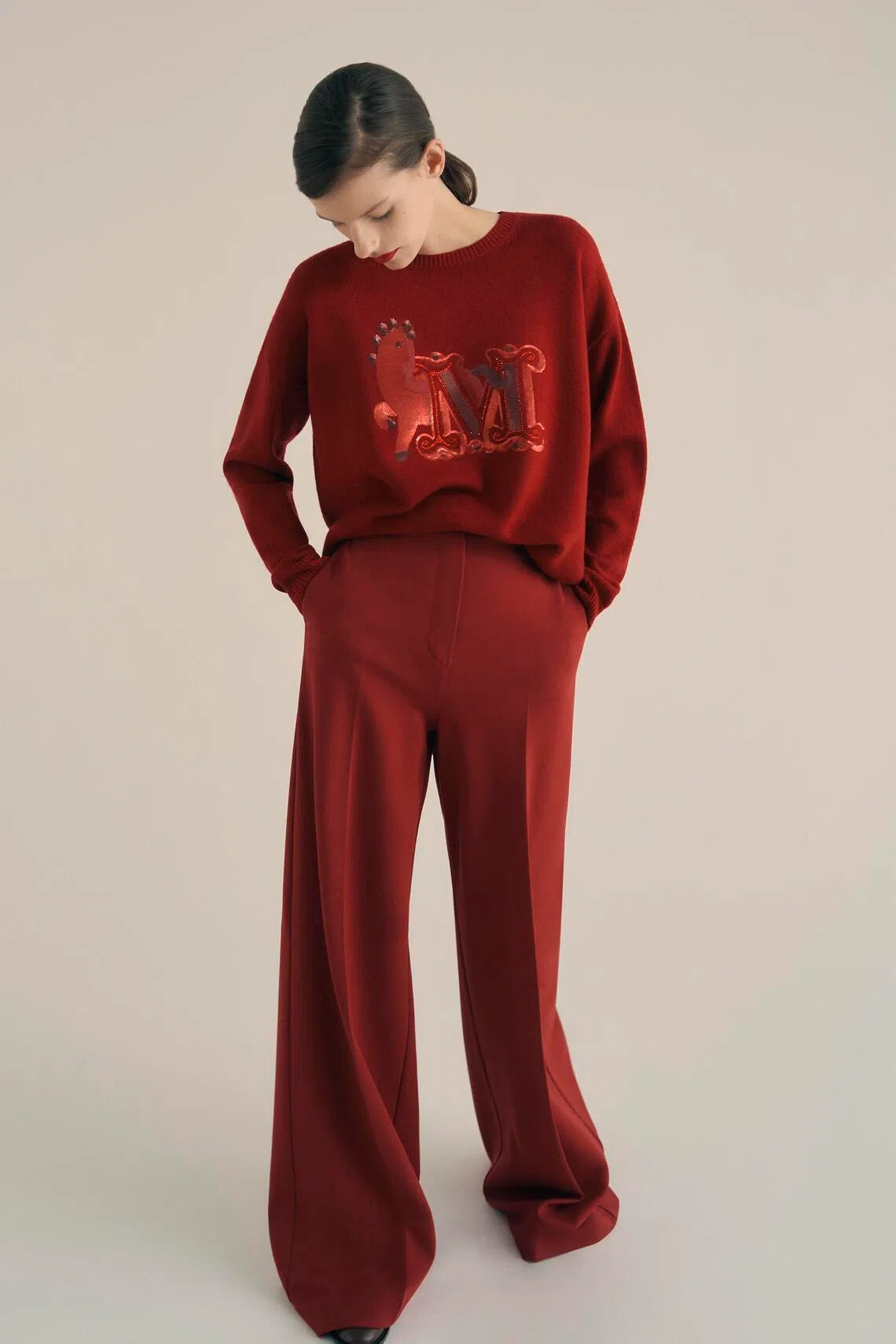 Over at Max Mara, a jumper (S$1,439) is adorned with sequins and rhinestones that form a stylised horse and “M” monogram. The shiny embellishments build on the eye-catching appeal of the jumper’s bright red tone, adding textural contrast and interest to the piece.