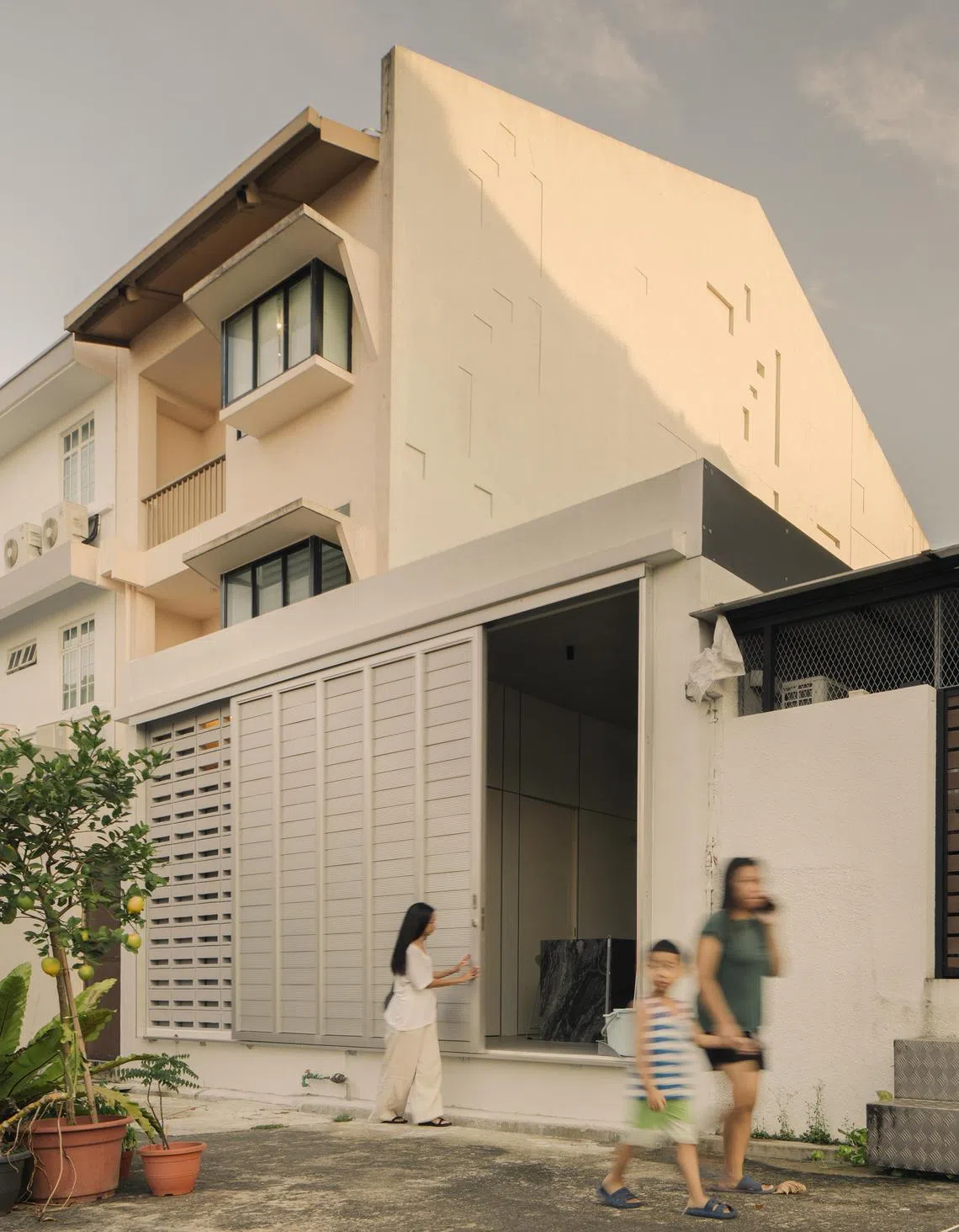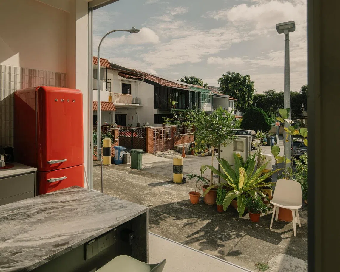 At the back of the house, the kitchen was raised to sitting height with respect to the adjacent alley. The idea was for the couple to host steamboat or barbecue parties in the alley, a sort of neighbourhood get-together. In the meantime, their visiting nephew and niece enjoy sitting there and interacting with passers-by. “The connectivity to the expanded environment was important to us. Our interaction with neighbours is enriched,” says Chaw.