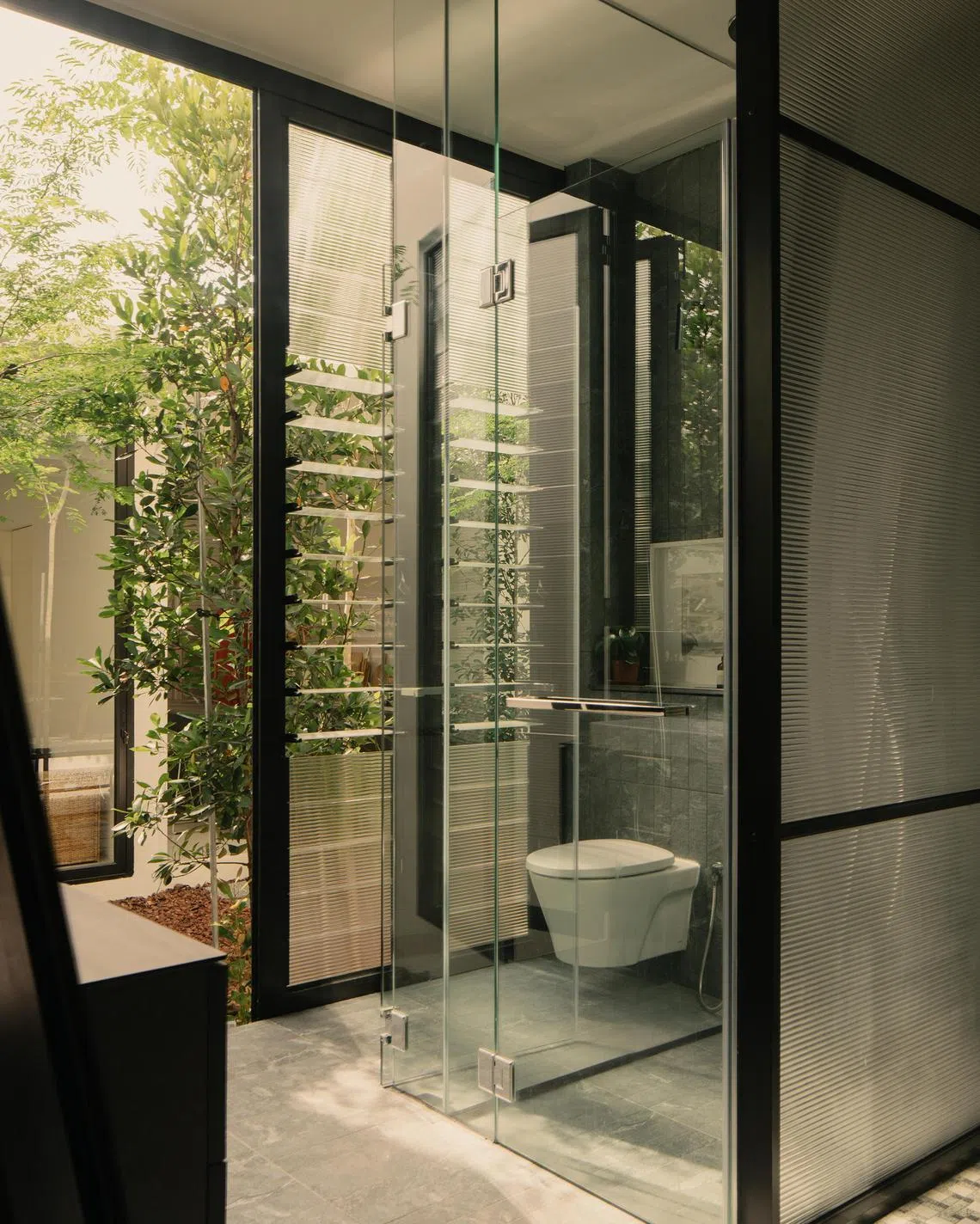 The open-air courtyard typically prompts perplexed guests to ask what happens in the event of a downpour. Chaw and Ho considered installing a retractable roof, but this would run counter to their intention to let the trees grow to their full height. “It speaks of a certain attitude towards nature,” he says. “In the courtyard, we subject ourselves to the whims and fancies of the weather. I must admit that such attitudes may not be everyone’s cup of tea, but at least it’s something that I’m willing to try out for myself. So, subjecting ourselves to what the environment gives us is the key philosophy to this design.”